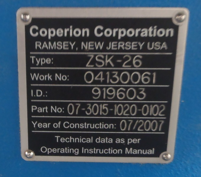 * Co-Rotating Twin Screw Extruder, Model ZSK-26. Maximum 1400 rpm screw speed. Unit driven by a 30 kw, 2650 rpm ac motor with VFD drive through a gearbox, 1.89:1 gear ratio. Extruder barrel is electrically heated, water cooled, vented, and consists of nine barrel sections allowing for approximately a 36:1 l/d ratio.